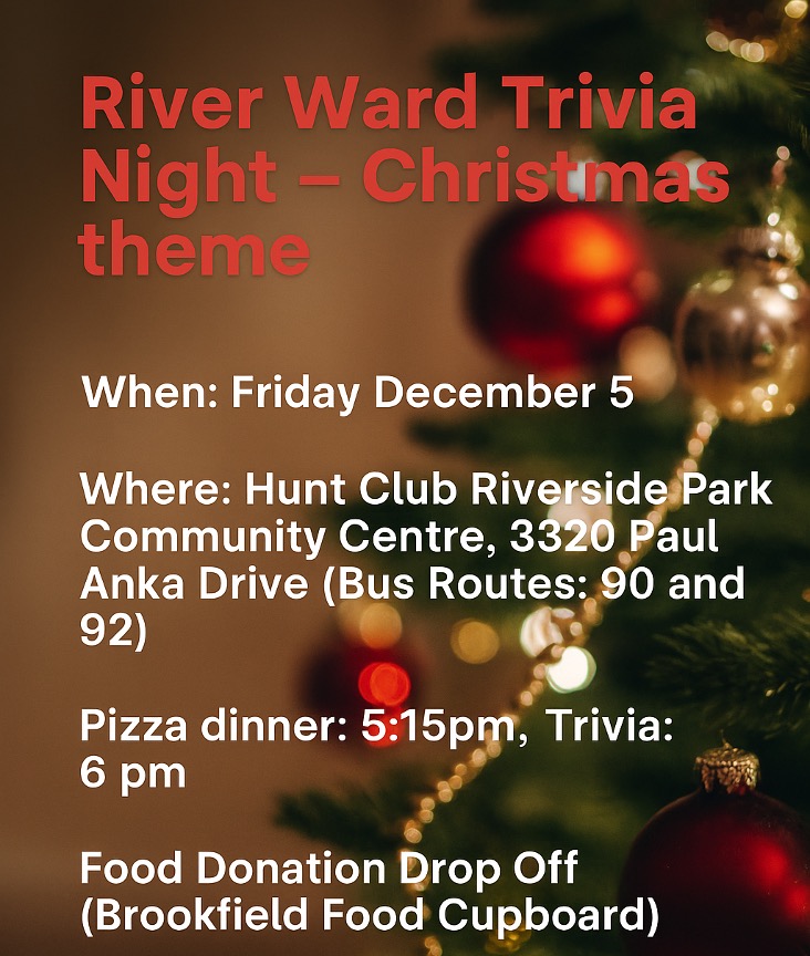 River Ward Trivia Night – Christmas theme When: Friday December 5Where: Hunt Club Riverside Park Community Centre, 3320 Paul Anka Drive (Bus Routes: 90 and…